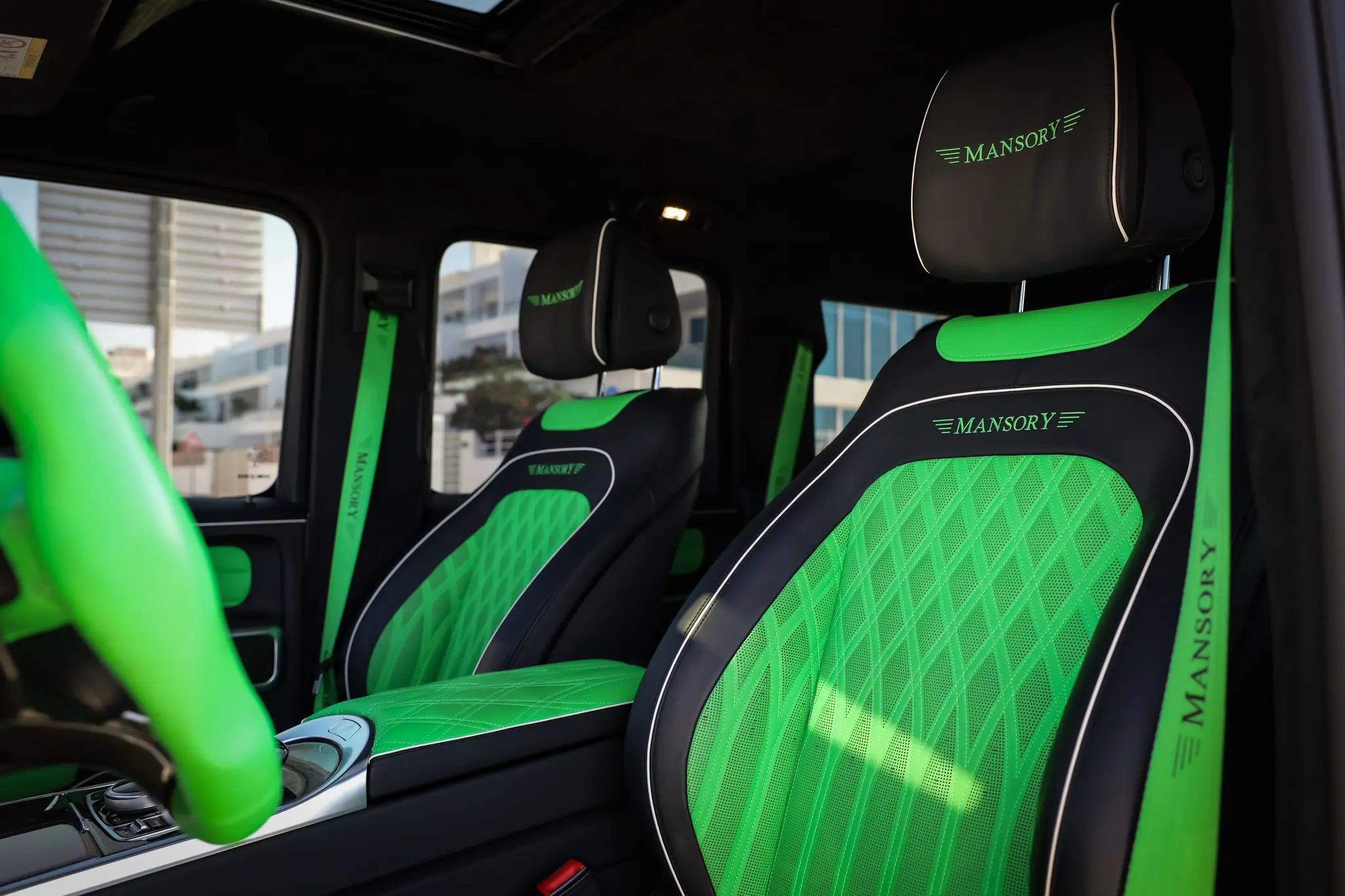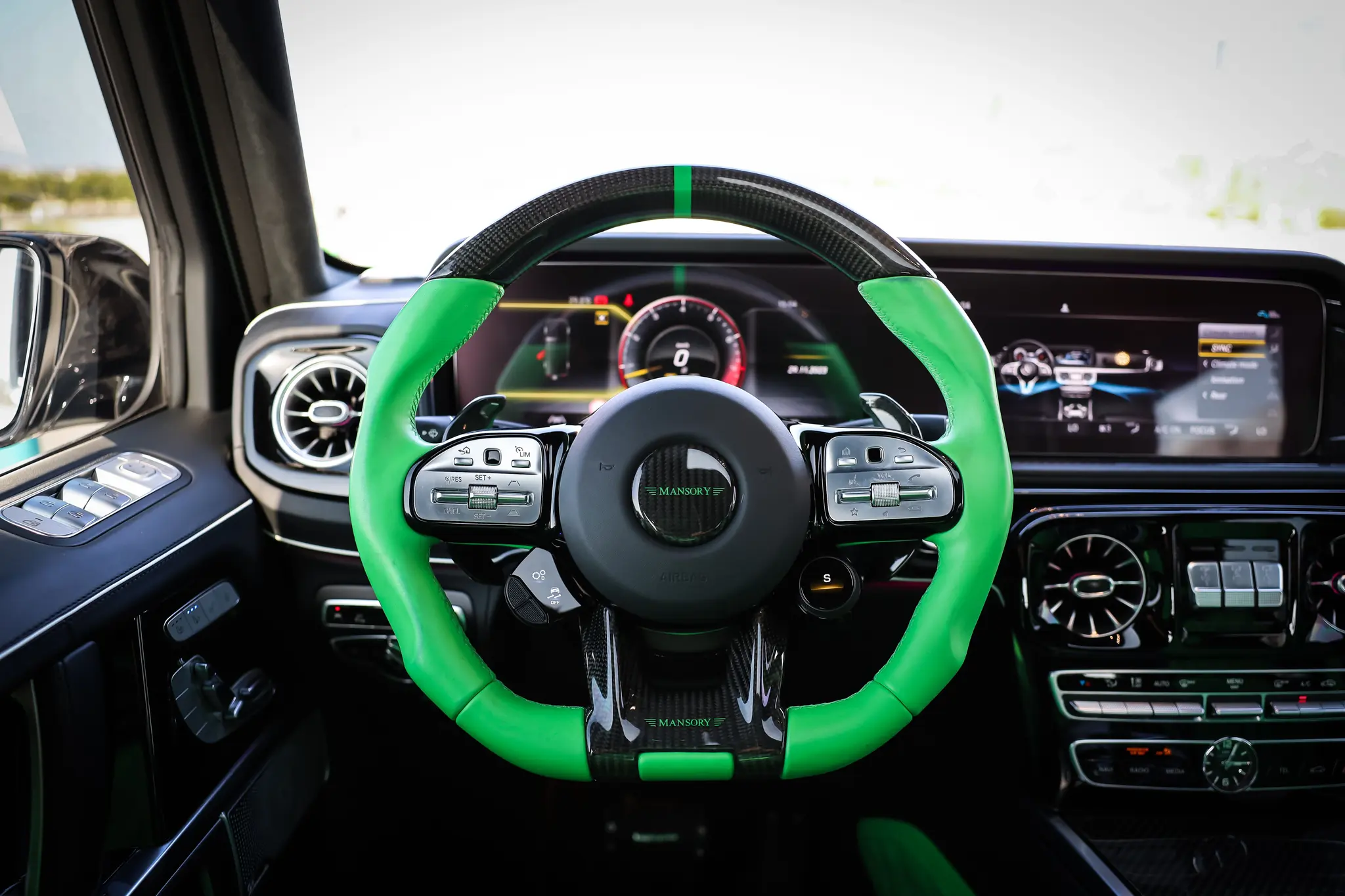 - Luxurious Interior: Premium leather upholstery with Mansory branding, carbon fiber accents, and customizable ambient lighting.
