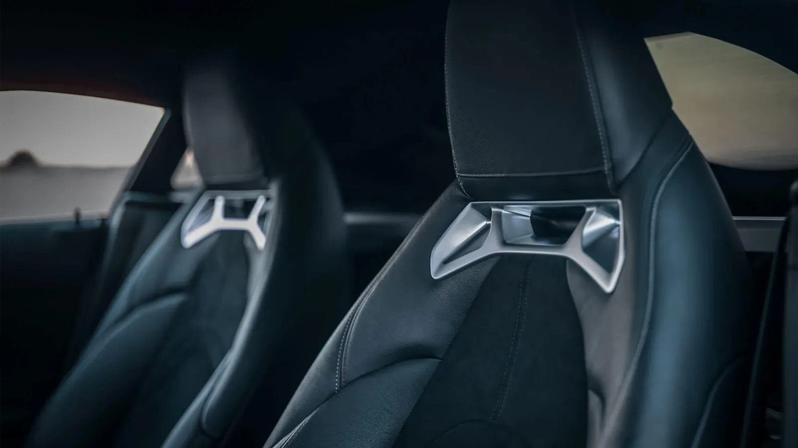 - Design: Sleek white exterior with aerodynamic lines, bold curves, and a distinctive double-bubble roof.